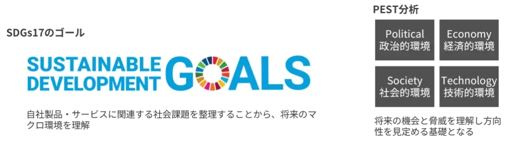 PEST分析やSDGsを活用し、政治・経済・社会・技術の観点から自社を取り巻く外部環境を整理します。
