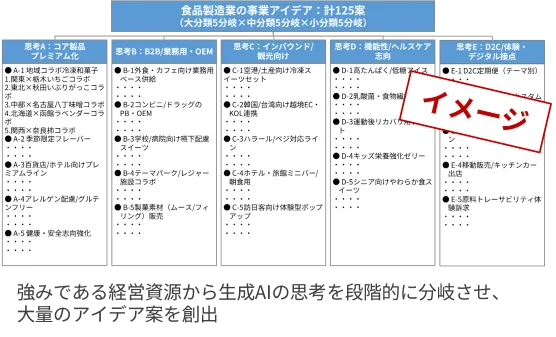 生成AIを活用して多様な発想を展開し、既存事業とのシナジーや新市場の可能性を探索します。