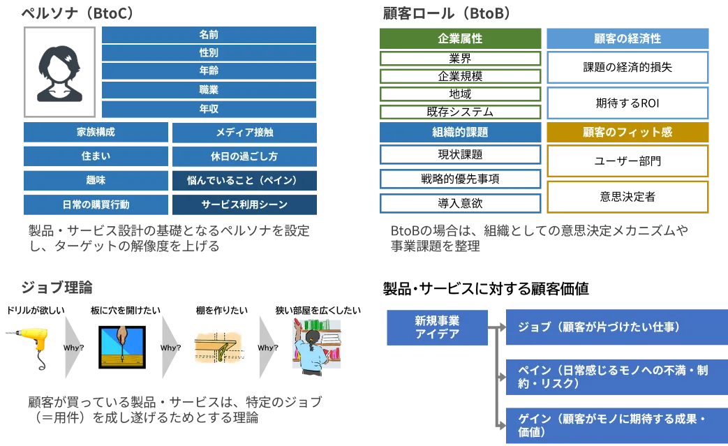ペルソナ設計やジョブ理論を通じて、顧客の行動・感情・期待を深く理解します。